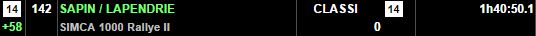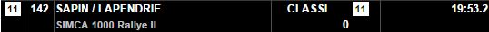 Classement de l'ES6 : Mickaël et Jérôme (portant le numéro 142 sur les portières) se sont classé en 11è position sur la première spéciale (VC) sur 22, les conduisant ainsi à une 14è place au classement générale des véhicules classiquessur 21 participants.